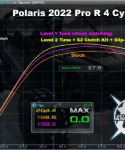 - Included Level 2 Tune:Â Â This tune is developed for a Pro R with our aftermarket exhaust on 91-93 octane. Â It has just a bit more timing and a bit more fuel over our Level 1. Â This tune adds +16 RWHP peak and a massive +19 RWHP at 38 MPH (This is gaining roughly +25 crank horsepower) putting you at roughly 250 crank horsepower with just a flash and exhaust! Â Our included Stage 2 clutch kit with this tune really helps the belt to grip and to help drive the extra power to the wheels.