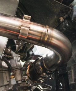 The Agency Power X3 race pipe is a great way to improve the performance and sound on your Can-Am Maverick X3 Turbo. The factory catalytic converter is located between the turbo charger and exhaust muffler. The new Agency Power pipe is straight through without any restriction. It is designed to be modular so it can be used with the stock muffler or aftermarket exhaust like our Valvetronic system. Each pipe is manufactured with T304 stainless steel piping that has been precision TIG welded in proven fixtures. The turbo connection flange has been CNC machined out of stainless steel and designed to reuse the factory band clamp. A flexible bellow is used to prevent cracking from the engine movement to the rigid exhaust mounts. The connection from the cat pipe to the muffler retains the spring clamp flange design to incorporate the stock springs. Each pipe also has an O2 bung welded on for the factory oxygen sensor. All pipes features AP logo brackets and name plate.