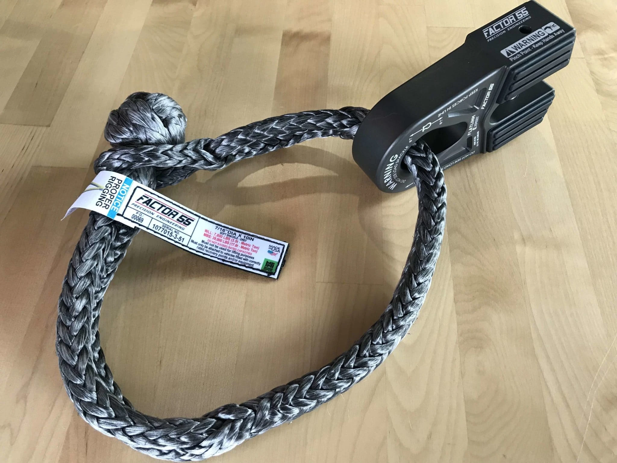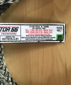 Soft shackles may be used as a lightweight replacement connecting rigging for common steel screw pin shackles. The Factor 55 10 inch Standard Duty Soft Shackles are Made in the USA under the uncompromised Factor 55 quality standards. Like all Factor 55 rigging products, these shackles have been lab and field tested to assure consistent repeatable minimum breaking strength values. Each Standard Duty soft shackle is constructed of 7/16 diameter UHMWPE 12 strand rope similar in construction to synthetic winch lines. WLL and minimum breaking strengths clearly marked. Minimum Breaking Strength – 39,000 pounds WLL – 7,800 Pounds. Weight – 6.3 ounces. Each individual soft shackle is serialized for manufacturing date and material lot traceability.