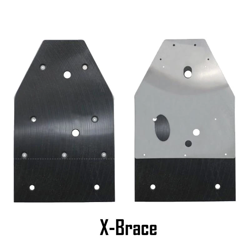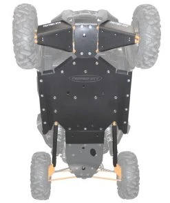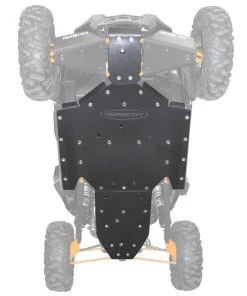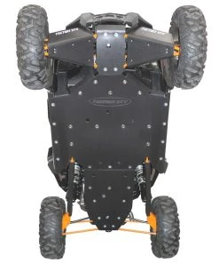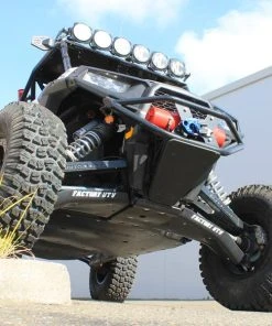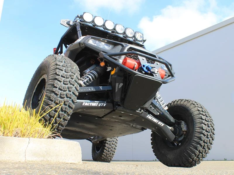 Factory UTV’s UHMW Skid Plates are the gold standard for UTV protection systems. OEM skid plates simply do not satisfactorily protect the underside of your UTV under normal off road operation. With items as important as your fuel tank and hydraulic lines right above the skid plates an alternative to the OEM skids is imperative for fun and safe off roading. Factory UTV has the answer with skid plates constructed from UHMW (Ultra-High Molecular Weight) plastic. Significantly lighter than aluminum, FUTV skids and A-Arm guards offer full protection for the undercarriage of your UTV. We’ve also added an X-Brace option under the engine/trans area of the RZR XP. “ ½” or 3/8” UHMW rear skid with an 1/8” inch 6061 high strength aluminum backing plate, X brace aluminum backing plate is installed in between UHMW skid and chassis frame, and limits the amount of impact absorbing skid plate flex in the rear vital areas. If your going to play hard in your RZR XP, you’ll need the added X-Brace protection. UHMW is tough, wear resistant plastic that combines an incredibly low coefficient of friction with outstanding impact strength, and will outwear carbon steel 10 to 1. Unlike aluminum, UHMW also has memory, meaning after a big impact hits aluminum will bend ,gouge and break while UHMW maintains it’s original shape. These skid plates are very TOUGH! Protect your investment today!
