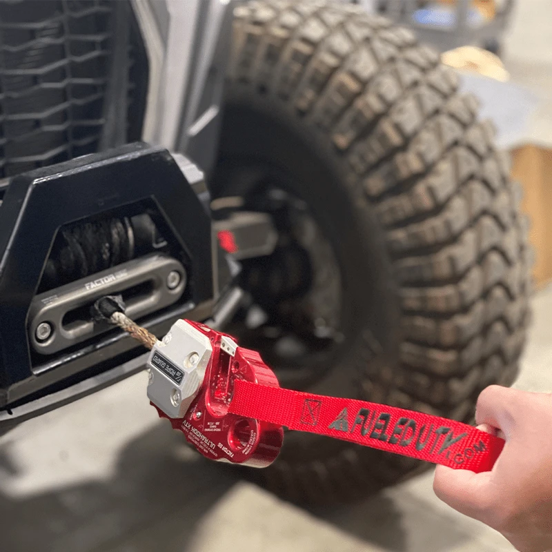 Our Fueled UTV winch pull strap has a loop which makes pulling a winch line a whole lot easier.