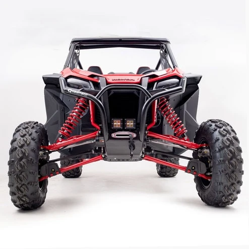 The HMF Defender HD Front Bumper for the Honda Talon 1000R/X is constructed from .095″ wall steel tubing and not only protects the front of the machine but also offers an integrated winch mount plate. The bumper also comes with a 3/16″ aluminum skid plate with a cutout to mount a winch fairlead. The bumper works with UTV fairleads with 6″ mounting hole spacing. LED lights may also be mounted on the bumper (see mounting options). All necessary hardware and instructions are included. Available color options will match the manufacturer’s color scheme.