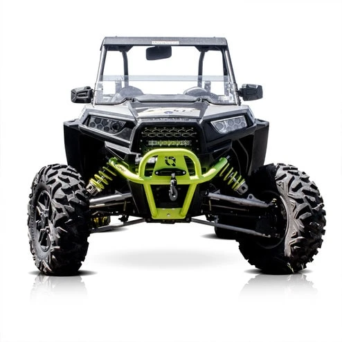 The HMF IQ Defender U4: Front Bumper for the Polaris RZR XP 1000 is built from .095″ steel tubing and offers an increased form of protection. The U4 bumper can house most winches up to 4,500lbs and works with UTV fairleads that have 6″ mounting hole spacing. LED Lights and a UTV Fair Lead can be installed on the bumper (See Mounting Options) and the bumper itself adds an incredible look to the front of the machine. See Winch Mount Dimensions