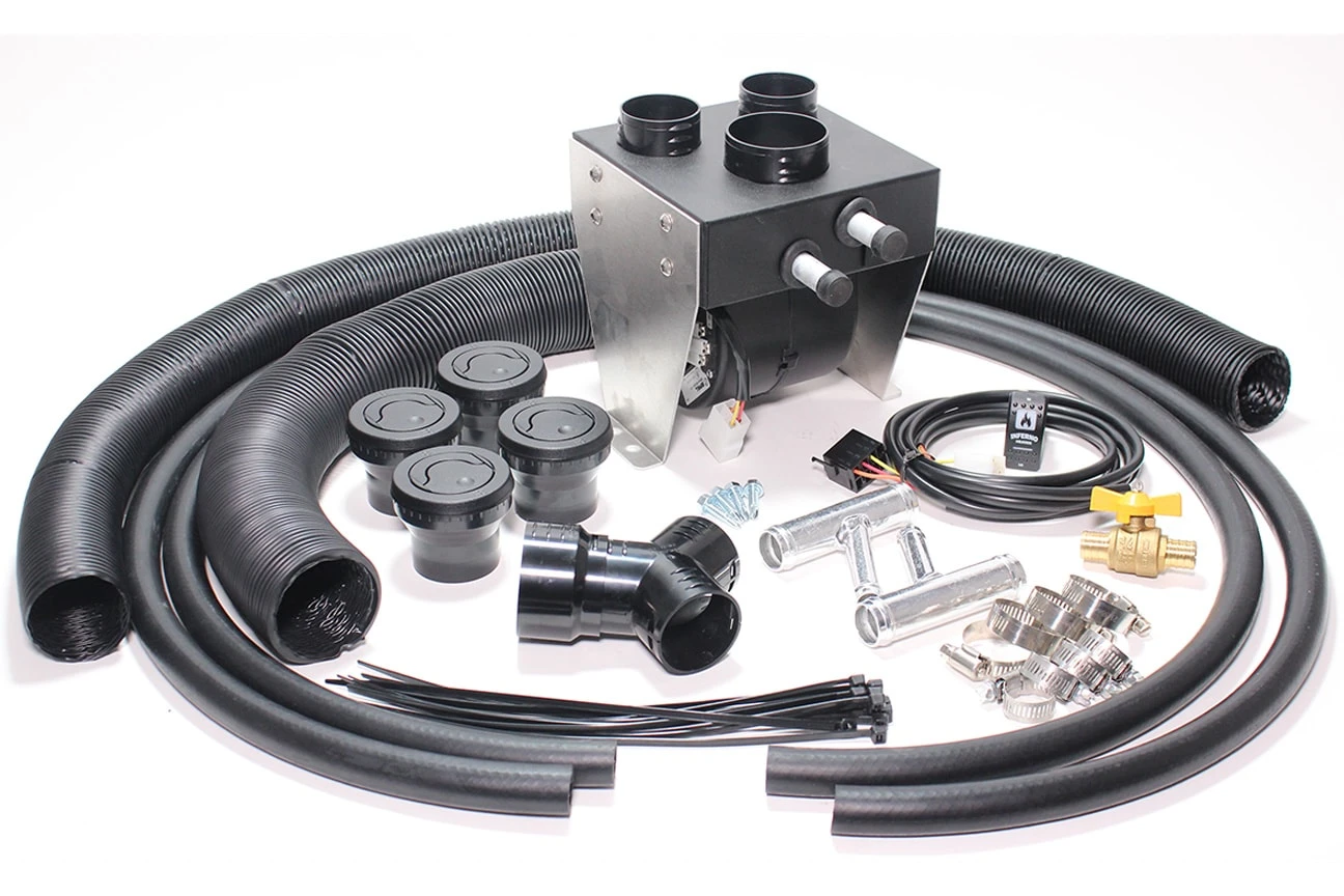 Includes all necessary components: heater hose, hose splicers, hose clamps, mounting brackets, defrost and floor louvers, ductwork & wiring.