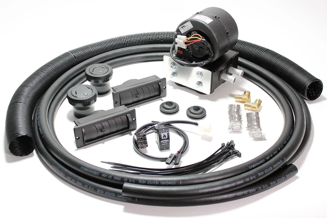 Includes all necessary components: heater hose, hose splicers, hose clamps, mounting brackets, defrost and floor louvers, ductwork & wiring.