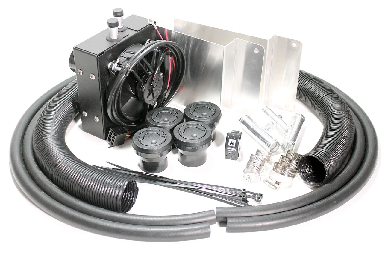 Includes all necessary components: heater hose, hose splicers, hose clamps, mounting brackets, defrost and floor louvers, ductwork & wiring.