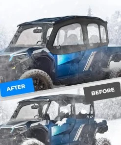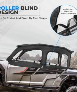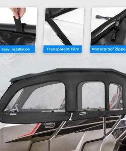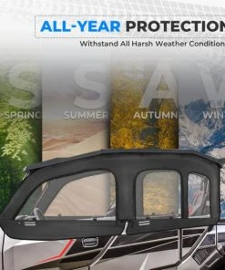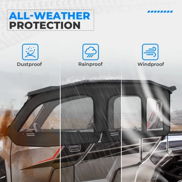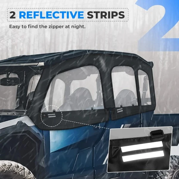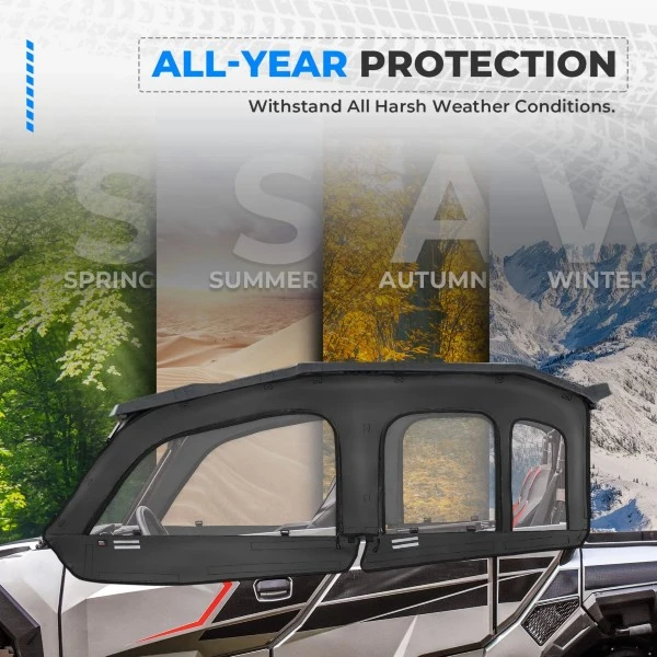 The zippered soft top door windows are designed to facilitate opening and closing the window within several seconds. Kemimoto UTV Cab Enclosure can keep out rain one minute and roll up to let in winds the next.