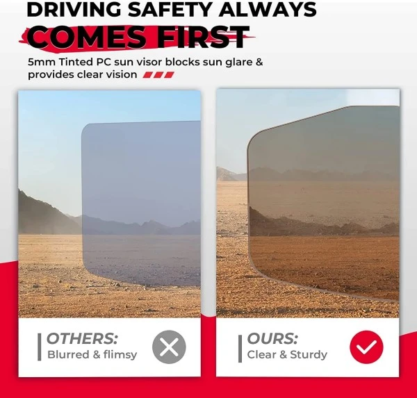- Anti-glare Visor:Β A 5mm tinted PC sun visor effectively blocks sun glare while providing clear visions. Driving safety always comes first. This sun visor will prevent sun glare from shining directly into your eyes.