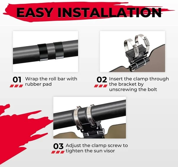 - Easy Installation:Β Just insert the mounting clamp through the upper part of the connector, then lock the mounting clamp to the round roll bars of your UTV. After that, simply install the sun visor to the lower part of the connector. You can easily install it on the driverβs side or passenger side. The package includes installing hardware and a mounting pad to avoid scratching your roll bar.