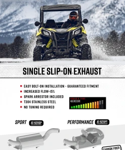 MBRP Powersports Performance exhaust offers an aggressive exhaust note and new design creates the signature MBRP sound. From visual appeal to great sound, MBRP is sure to make your SXS/UTV stand out. Constructed from 304 stainless, equipped with a USFS spark arrestor, this exhaust comes bolt on ready to perform right out of the box.