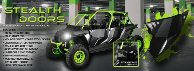 Pro Armor Stealth Door fits right over your stock door uses the existing hinges and door latches and gives your RZR a brand new look. This door is made out of .080 thick Aluminum with unique mesh cut-out grills and scoops for added ventilation. Easy install using existing and included hardware. Full length to the bottom of the opening improves your total coverage.