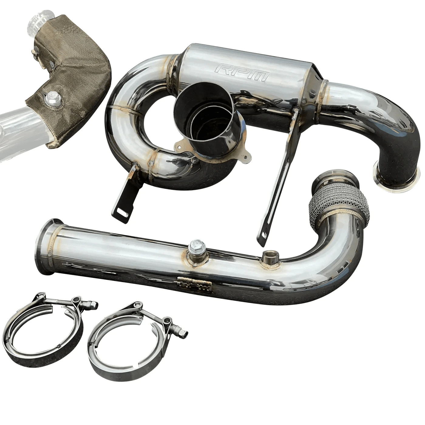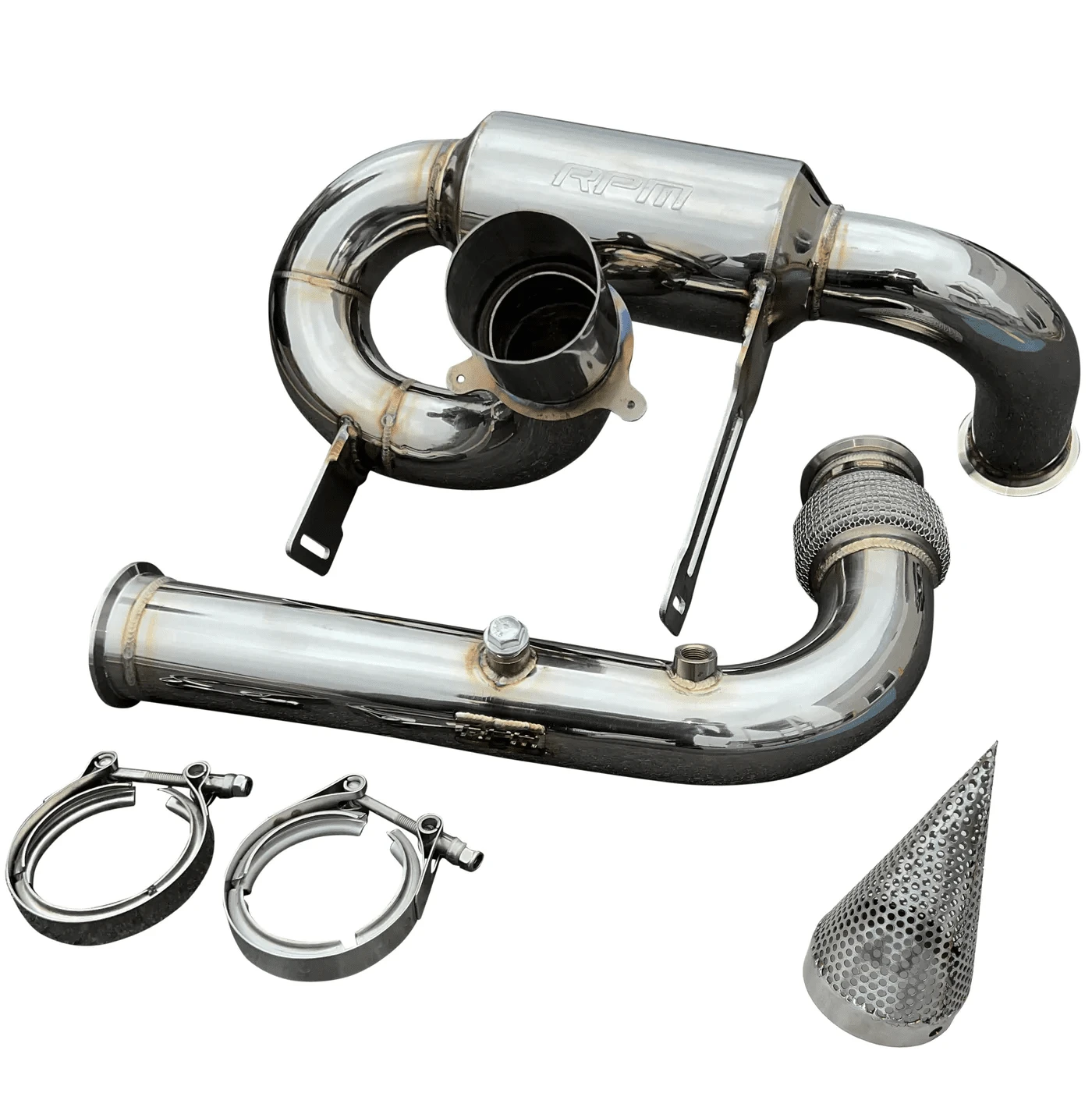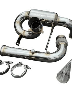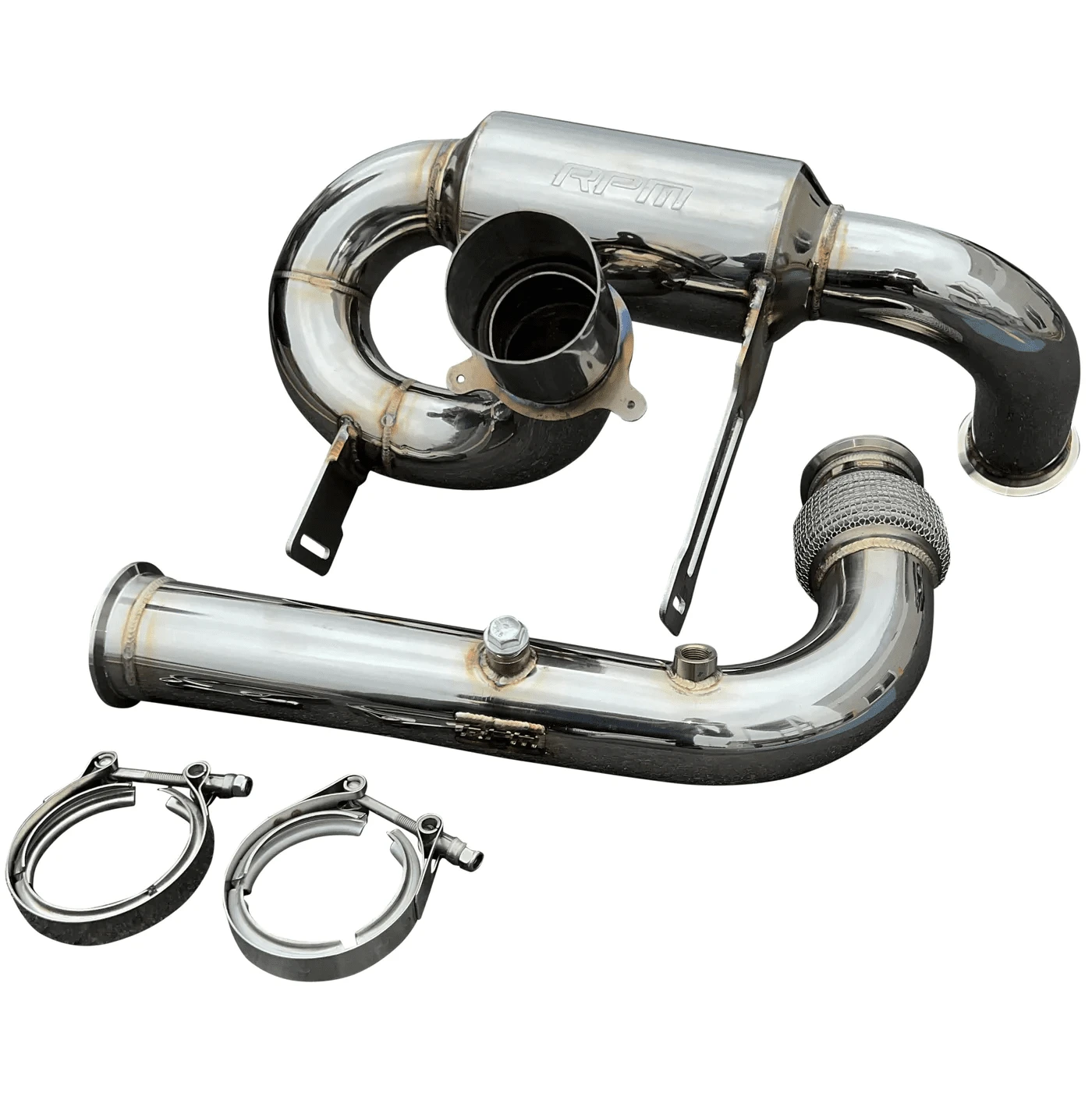 With the popularity of our RPM Sport Muffler and BRP’s increase in power over since that exhaust was built PLUS the amount of power these machines are now capable of easily making, we knew it was time to build something bigger! That’s what was accomplished! Introducing the FULL 3″ Monster Core RPM exhaust system. Starting with our turbo size-matched flange we quickly move to the HD chain-link flex pipe. From here we move to our smooth transition bend catless mid-pipe that has TWO O2 bungs pre-installed. The muffler and mid-pipe are connected with a V-Band clamp. Moving to the muffler we’ve incorporated a similar design to our 2.5″ muffler. The most important part of this party is the 3″ perforated muffler with an internal baffle that produces music to the ears. Our muffler system utilizes the factory tip and rear fascia! The factory chassis-mounted heat shields can be used, and a new exhaust hanger bracket IS included! A factory spark arrestor can be used.