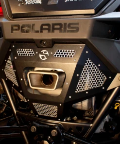 SDR Motorsports Rear Exhaust Covers are finished in a smooth Semi-Gloss Black Powder coat finish (great for applying graphics or a wrap) with Raw aluminum grille inserts you can leave raw or match to the color design of your build.