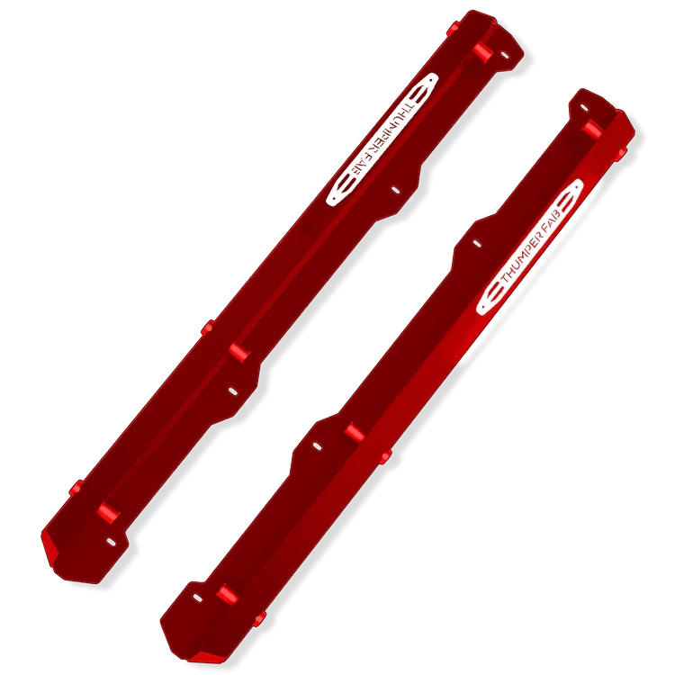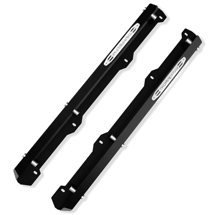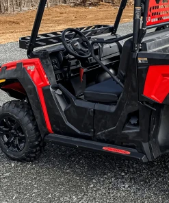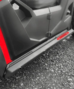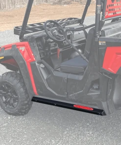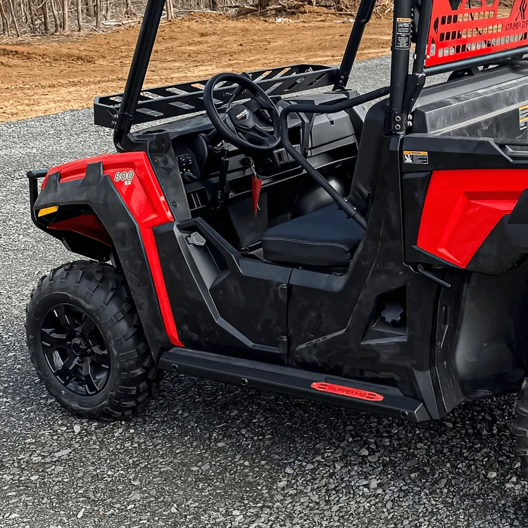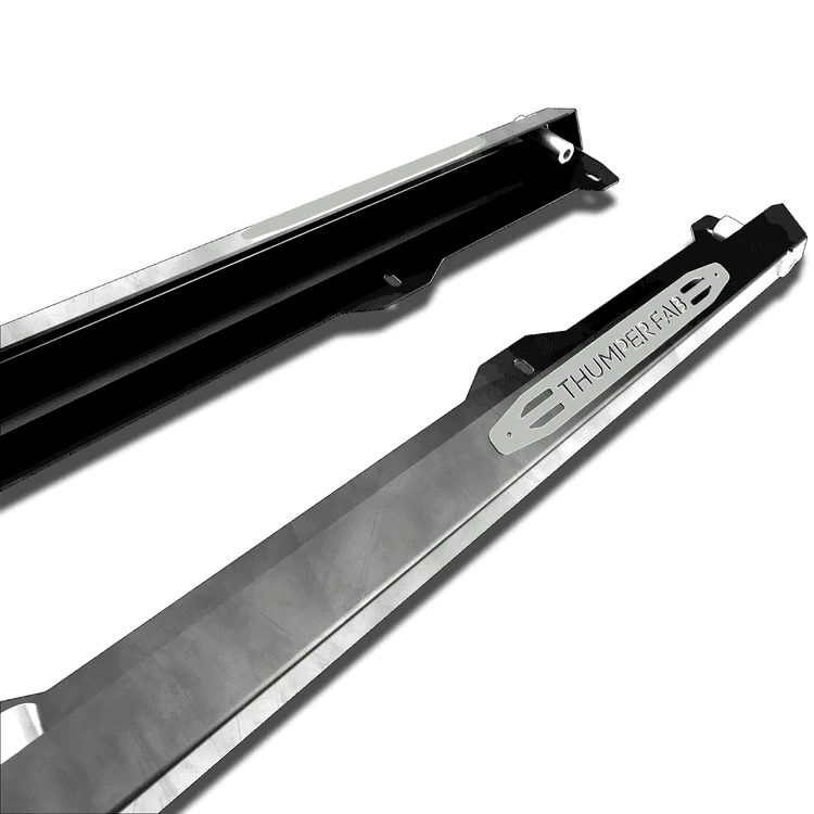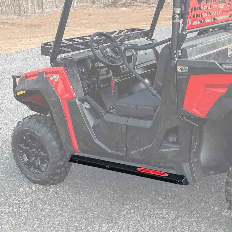 These Tracker 800SX 3-Seat Nerf Rails are sleek, bold, and amazing! With their streamlined look and strength, they are perfect for accessing your Thumper Fab roof rack or protecting your UTV from brush and trail debris. Made in the good ole U.S.A., these bad boys are stout and will provide great protection against trail obstacles contacting the OEM doors and plastic rocker panels.