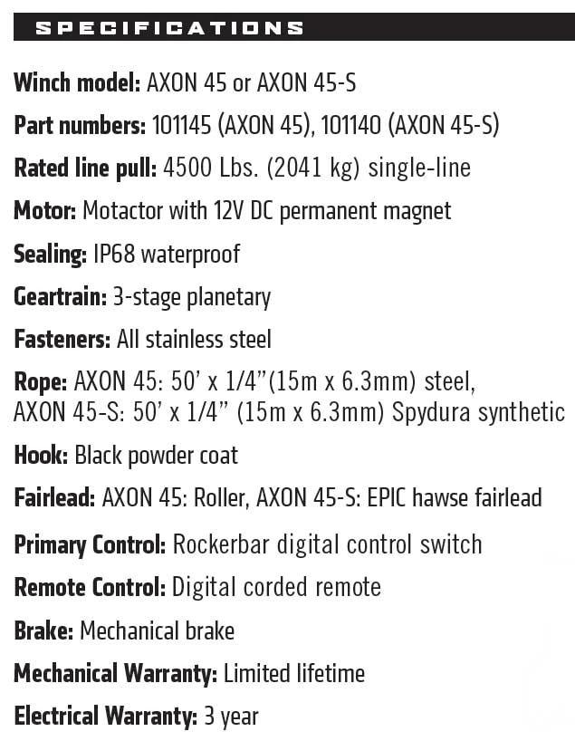 - AXON 45-S includes 50â of lightweight, easy-to-handle Âźâ Spydura synthetic rope, an Epic hawse fairlead, and a black hook