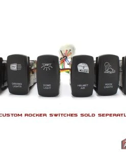 Designed for the Polaris RZR XP’s, the PCS-72S has become our most universal Power Control System with Strobe System for switch mounting locations. The switch harness has three rocker switches that mount in the center dash, followed by a single switch mounted right of the steering wheel, and then two more go left of the steering wheel. Also, rocker switches can be installed together in any custom way deemed fit by the installer as well. The Strobe System has 7 different flashing patterns that can be cycled through using the included black mountable switch. Moreover, a Molex connector links the switch harness to the main Power Control System.
